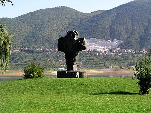 Diva Grabovčeva u dorištu Crkve Rama-Ščit, autor kipar Kuzma Kovačič